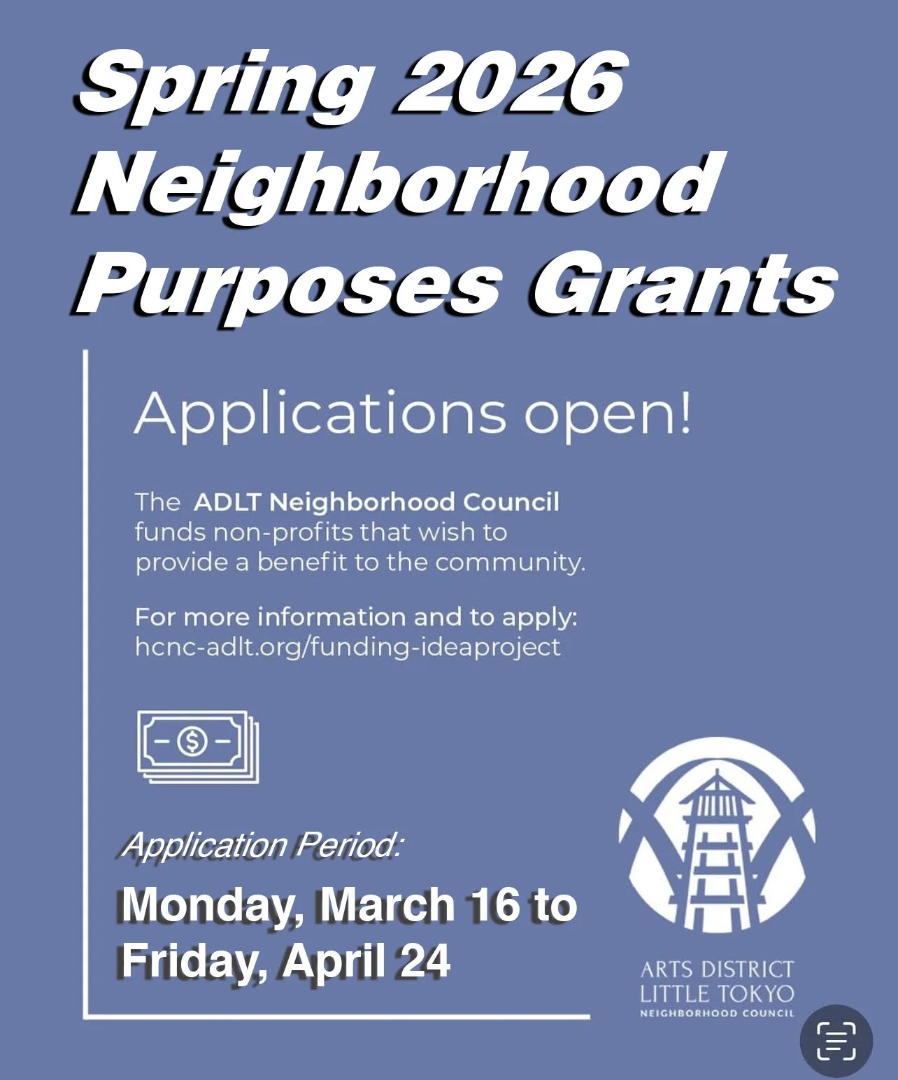 The Arts District / Little Tokyo Neighborhood Council (AD/LT NC) does not accept NPGs on a rolling basis, and prioritizes organizations within the AD/LT NC boundaries.